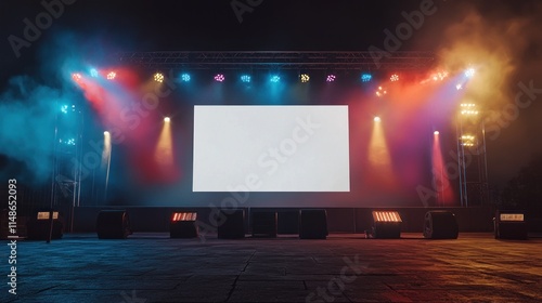 Empty Stage at Night with Colorful Lights and Blank Screen