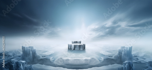 Empty stone pedestal, winter background. Modern product display. Minimal mockup template. Generative AI