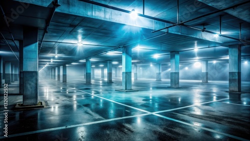 Empty subterranean parking garage at night with wet floor and atmospheric lighting