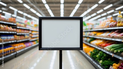 Empty supermarket display board in aisle with groceries on shelves. Product space for advertising or signage. Grocery store setting. The concept of shopping and retail.