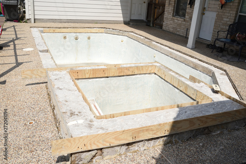Empty swimming pool under remodel with wooden forms for new tile and coping and concrete