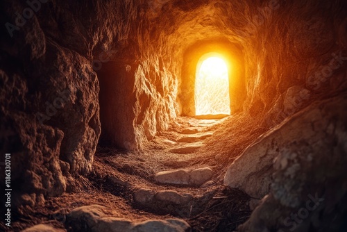 Empty tomb while light shines from the outside. Jesus Christ Resurrection. Christian Easter concept.