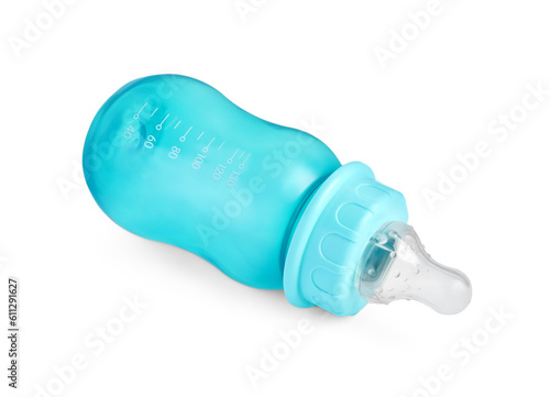Empty turquoise feeding bottle for baby milk isolated on white