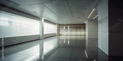 Empty white concrete hall interior with artificial and daylight and reflections on floor. Empty office. Copy space for text or mock-up. Generative AI