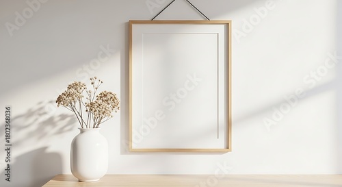 Empty wooden frame, dried flowers in vase, sunlit minimalist decor.