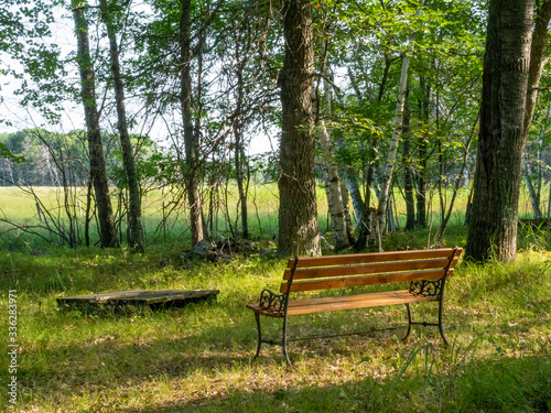 Empty wooden park bench in a peaceful forest among tall trees near a quiet meadow.