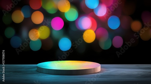 Empty wooden pedestal with colorful bokeh lights