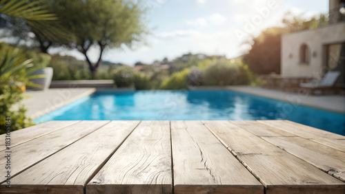 Empty wooden table surface in foreground with a blurred background of a luxurious swimming pool and sunny villa exterior
