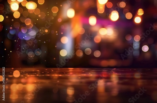 Empty wooden table top on blur light gold bokeh of cafe restaurant in dark background surrounded with light spots illusion.