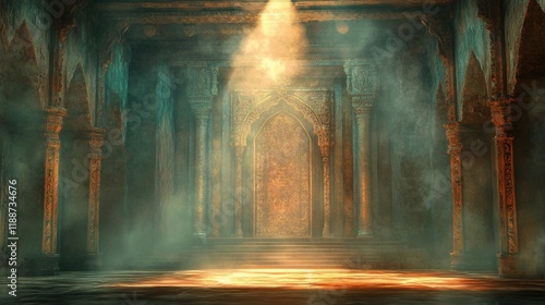 Enchanted Ancient Hallway with Mystical Light and Atmospheric Fog