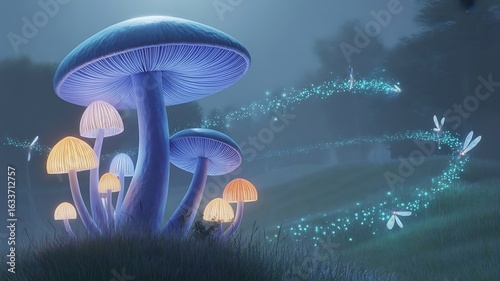 Enchanted forest at night with glowing mushrooms and magical fairy lights