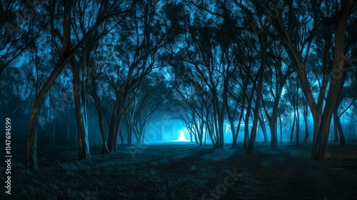Enchanted Forest Path with Glowing Mystical Figure Amid Dark Trees and Ethereal Blue Fog