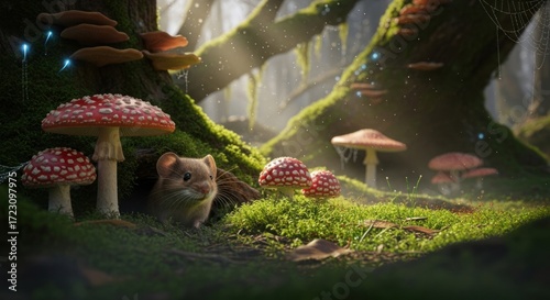 Enchanted Forest Scene with a Small Mouse and Red Mushrooms.