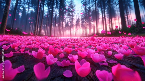 Enchanted Forest with Pink Petals during Sunrise, Dreamy Atmosphere with Sunlight Filtering through Trees