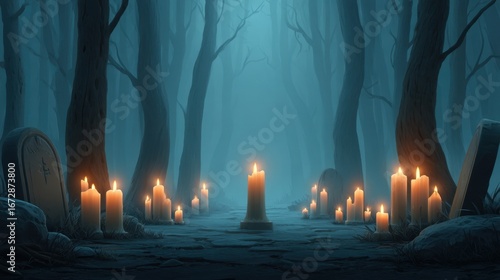 Enchanted Misty Forest with Glowing Candles and Ancient Gravestones at Twilight
