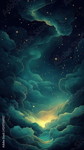 Enchanting cosmic dreamscape with glowing clouds and golden starry sky