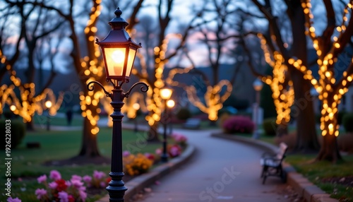 Enchanting Park Scene Dusk with Vintage Lamp Posts