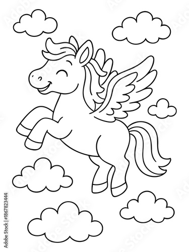 Enchanting Pegasus in Flight: A whimsical illustration depicts a majestic Pegasus soaring through a sky filled with fluffy clouds. Capturing a sense of wonder and fantasy.