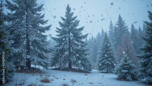 Enchanting winter forest under a gentle snowfall with droplets dancing in the air at dusk