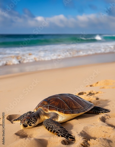 Endangered Sea Turtle Making Its Way to Nesting Ground on a Quiet Beach