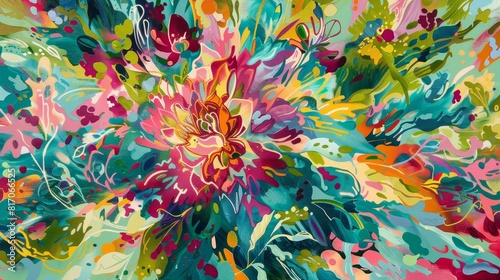 Energetic floral explosion: vibrant turquoise lime green fuchsia hues in kaleidoscopic display background
