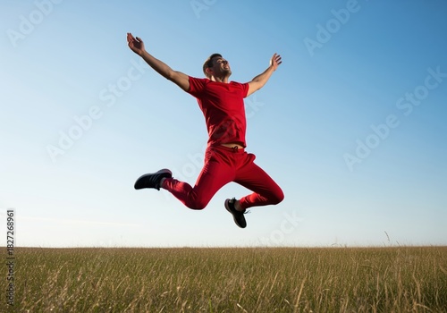 Energetic man in red sportswear joyfully leaping high into the air