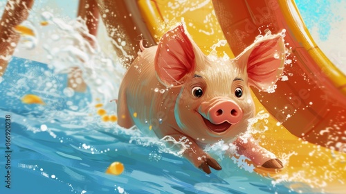 Energetic Pig Sliding Down Water Slide into Pool for Summer Fun Illustration Design
