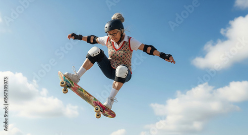 Energetic Senior Woman Performing Aerial Skateboarding Trick – Active Aging, Empowerment and Sports Lifestyle Concept with Clear Sky Background