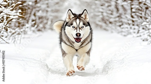 Energetic siberian husky joyfully runs through a snowy landscape showcasing the beauty of winter adventures