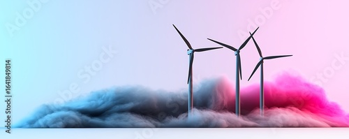Energy stock market wind concept, Three wind turbines stand against a gradient backdrop of blue and pink clouds, symbolizing clean energy and modern technology in sustainable practices.