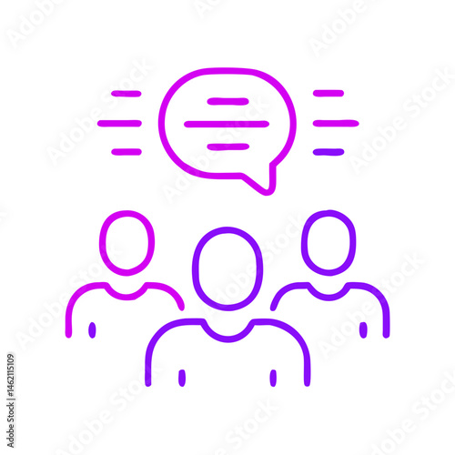 Engaging discussion among three people in a vibrant purple outline design with a speech bubble