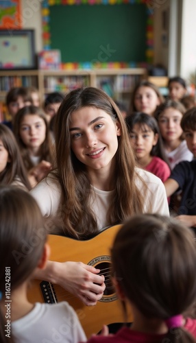 Engaging Female Teacher Leading Musical Guitar Lesson in Bright Classroom