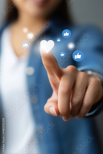 Engaging user touches virtual reactions on screen with heart and thumbs up icons
