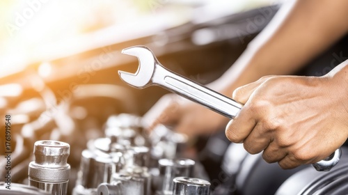 Engine Technician's Precision: A skilled technician's hands meticulously working on the inner workings of an automobile engine, focusing on technicalities.
