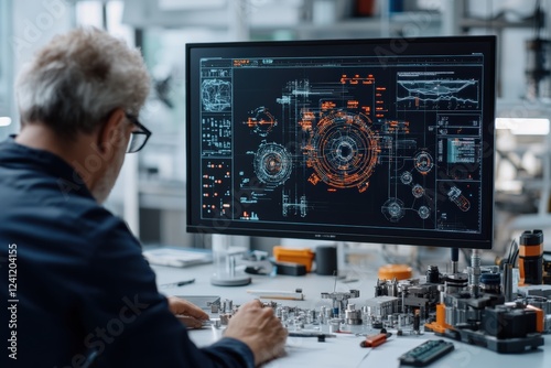 Engineer analyzing complex data on futuristic computer screen, enhancing technology solutions through advanced data analytics and innovative design.