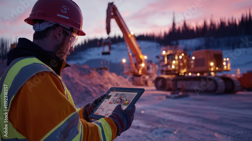engineer analyzing data on tablet at construction site
