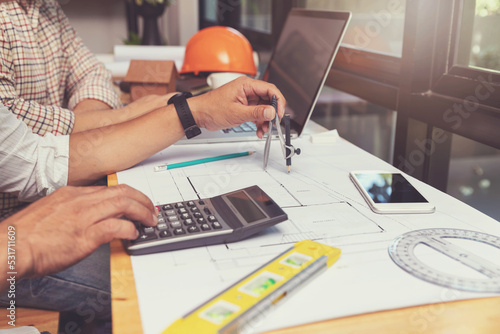 Engineer and Architect concept, Engineer Architects and Interior designer working with blueprints.Vintage effect