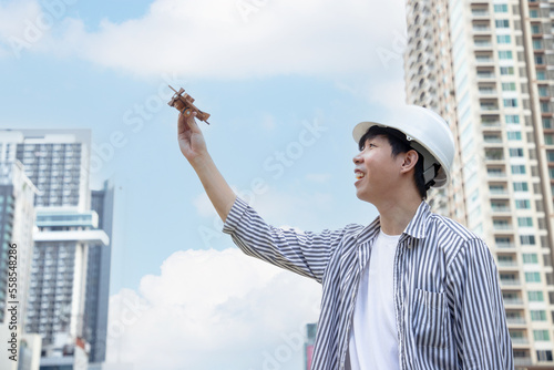 Engineer Asian man playing wooden airplane in the park outside near cityscape. Guy running with a toy plane outdoors and blue sky. Engineer role play concept.