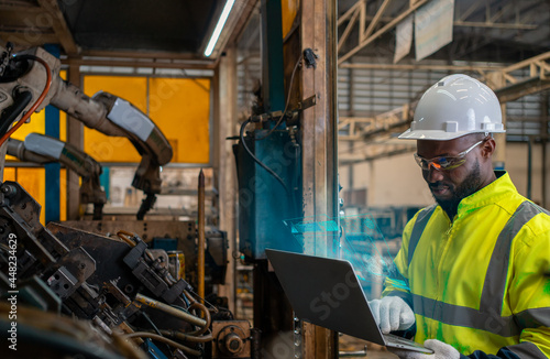 Engineer check and control automation robot arms.Robot arms machine in intelligent factory industrial on monitoring system software. Welding robotics and digital manufacturing operation.