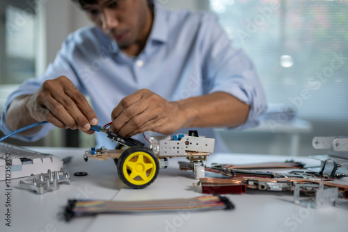 Engineer connecting cable to robot prototype in modern laboratory