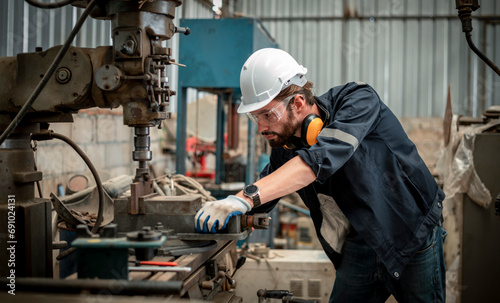 Engineer factory industry wearing safety uniform work and checking system of the welding robots for welding steel electrical by control system robot automate for industry manufacture concept.