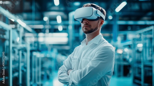 Engineer in a white VR headset at a high-tech factory. The future of manufacturing and innovation