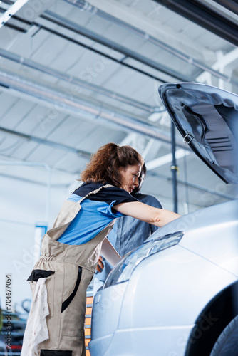 Engineer in garage finishing fixing car for african american customer, looking underneath vehicle hood to remove remaining oil leaks. Worker does routine engine cleaning on client automobile