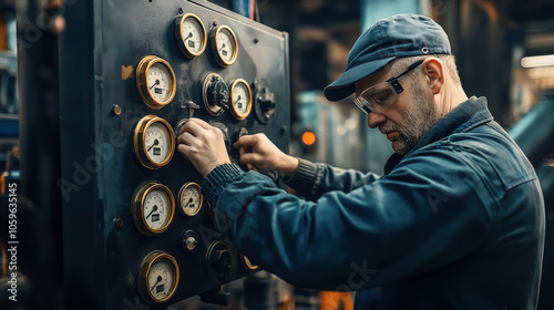 Engineer in protective eyewear and hat adjusting controls on industrial panel with pressure gauges in a factory setting, focusing on technical equipment maintenance.