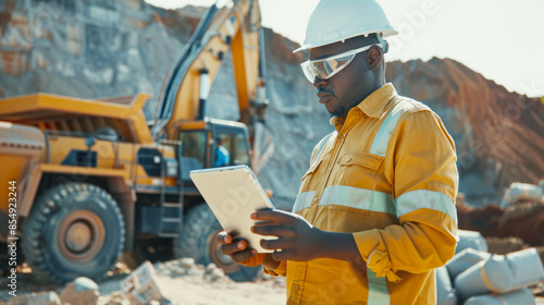 Engineer inspecting with a tablet in quarry