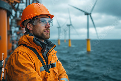 Engineer overseeing offshore wind turbines in windy weather
