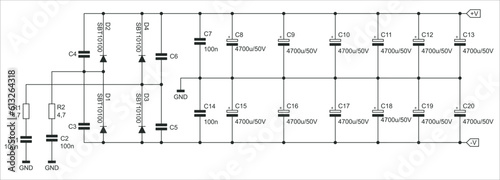 Engineer scheme of electronic device. Vector drawing electrical circuit with resistor, capacitor, diode and other components. Schematic background on white paper sheet.