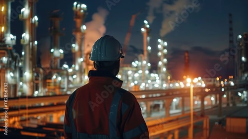 Engineer survey team wear uniform and helmet stand workplace checking blueprint project and radio communication inspection work construction site with night lights oil refinery background.