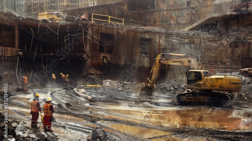 Engineer team with excavator, technology to build safe and strong structure such as house or tower. Teamwork of architect worker group working construct infrastructure or construction in city. AIG53.