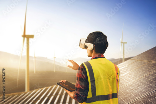 Engineer working with technology metaverse with VR headset for plan or checking operation of field of photovoltaic solar panels and wind turbine power plant on the mountain. Concept renewable energy.